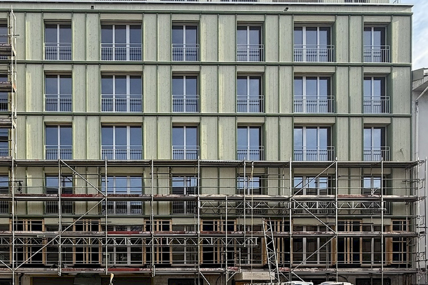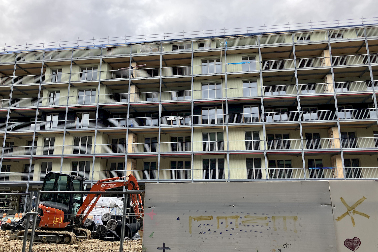 Auf Baufeld C sind die Arbeiten in vollem Gange. Seit über 15 Jahren passt sich das in drei Baufelder A, B und C unterteilte Projekt in der Siedlung Birs kontinuierlich den Bedürfnissen der Bewohnenden und Genossenschafter:innen als auch den Ansprüchen an nachhaltiges Bauen an. Ursprünglich als Betonbau geplant, wird der. Neubau Lehenmatt nun als Holzbau umgesetzt. Nur noch das Sockelgeschoss und die Treppenkerne sind aus Beton, die restlichen Elemente (Decken, Wände, Fassade) wurden mit vorgefertigten Holzelementen erstellt. Mit einer Länge von 80 Metern setzt der sechs Stockwerke hohe Neubau einen innovativen Akzent im Lehenmattquartier. Insgesamt entstehen darin 48 Wohnungen und gemeinschaftlich nutzbare Flächen. Flexibilität steht im Fokus: Genau wie im bereits erstellten Neubau Birs ermöglichen Zusatzzimmer eine mittelfristige Anpassung der Wohnungen an sich verändernde Lebensumstände. Der Mix der Wohnungsgrössen reicht von 2.5 bis 5.5 Zimmern pro Wohnung. Im Erdgeschoss entstehen eine Freizeitwerkstatt und ein Siedlungstreff, während auf den Gemeinschaftsterrassen im Attikageschoss Raum für Erholung geboten wird.