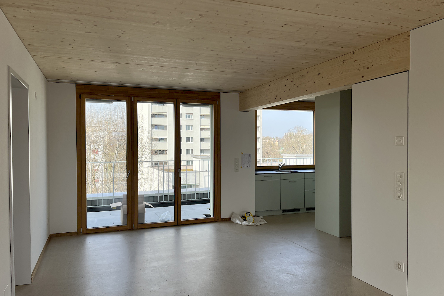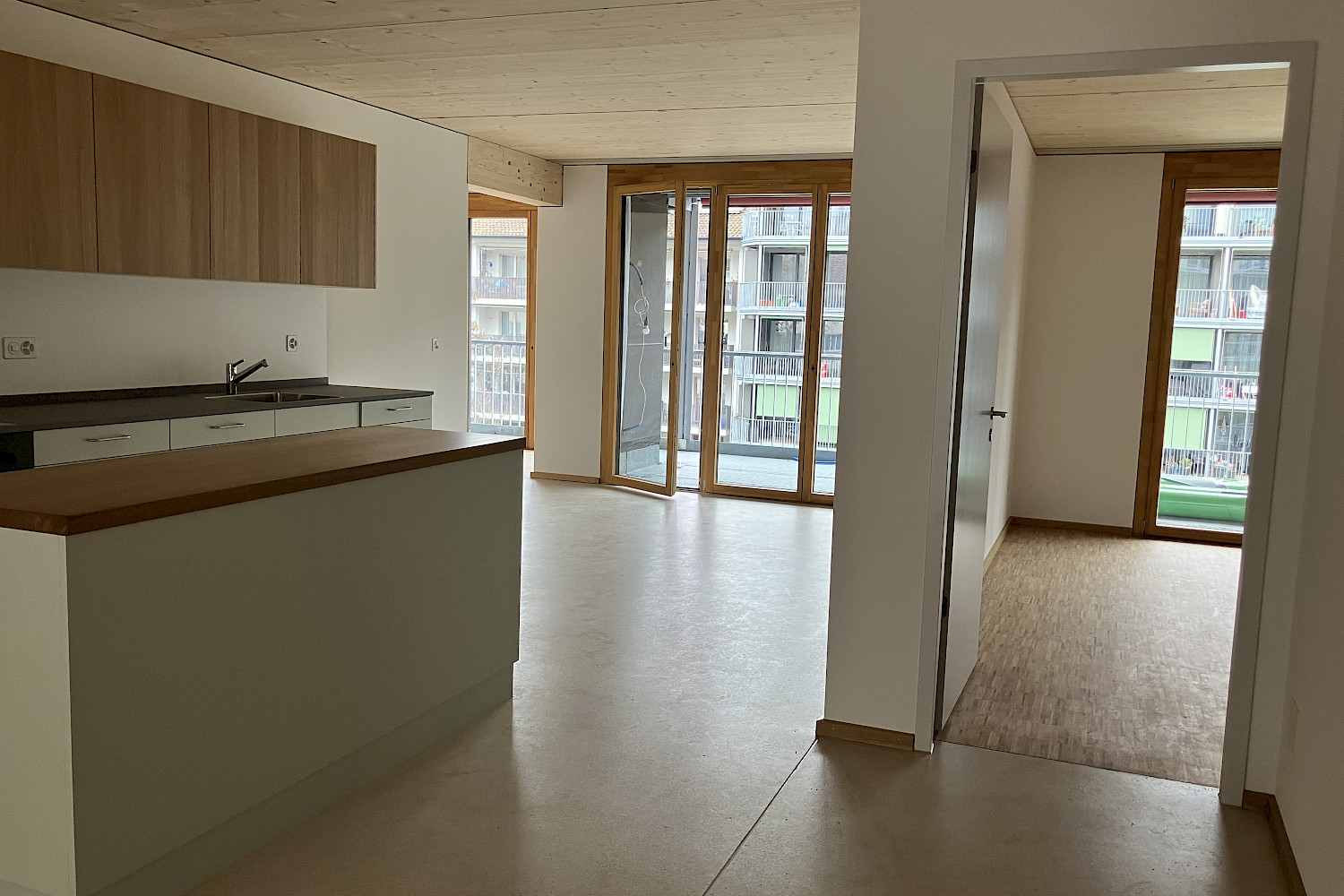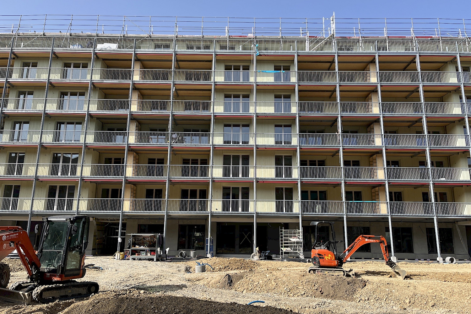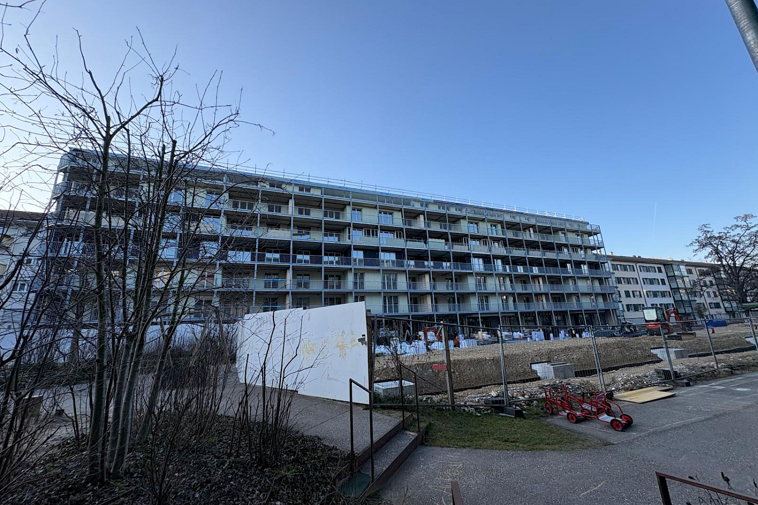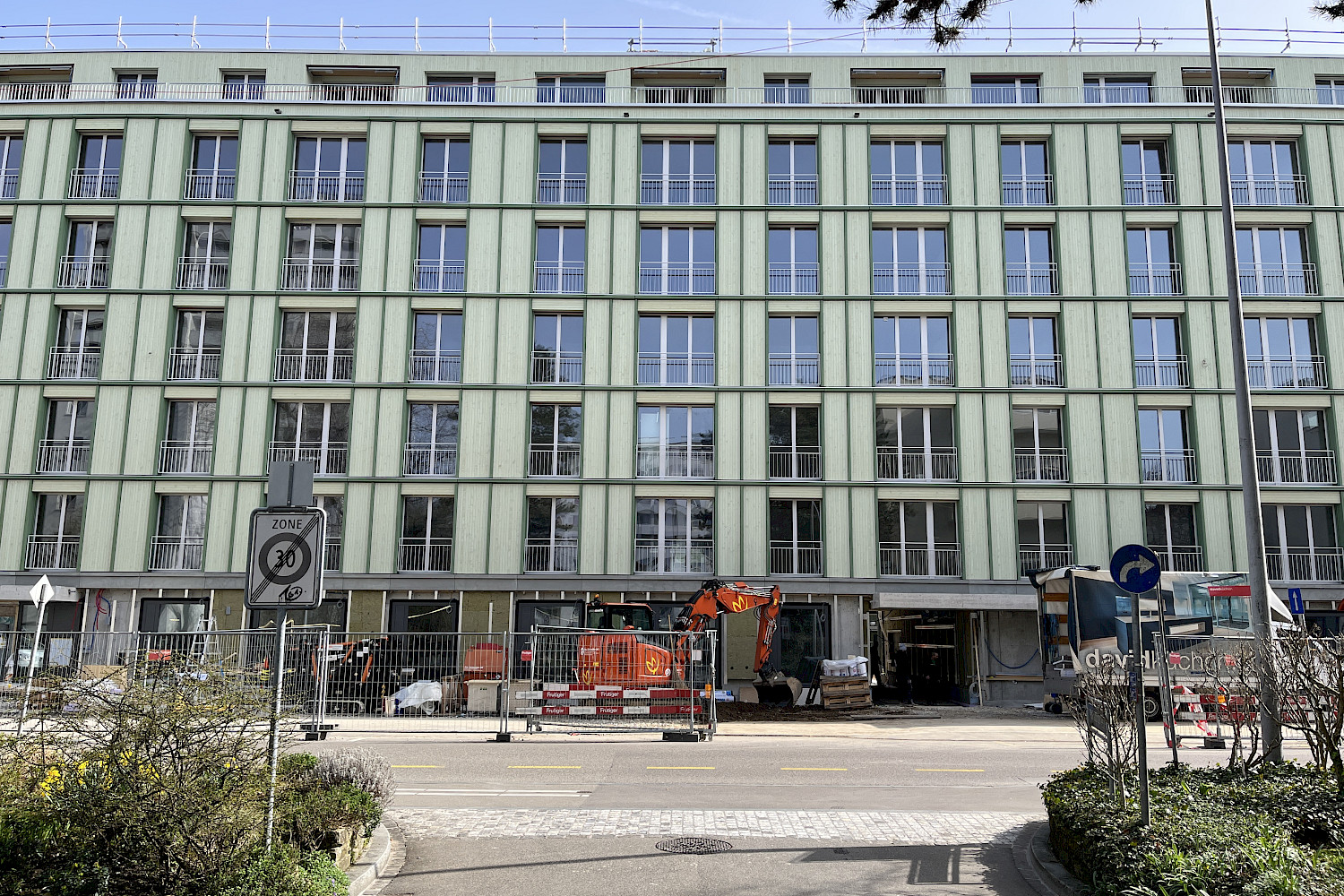 Auf Baufeld C sind die Arbeiten in vollem Gange. Seit über 15 Jahren passt sich das in drei Baufelder A, B und C unterteilte Projekt in der Siedlung Birs kontinuierlich den Bedürfnissen der Bewohnenden und Genossenschafter:innen als auch den Ansprüchen an nachhaltiges Bauen an. Ursprünglich als Betonbau geplant, wird der. Neubau Lehenmatt nun als Holzbau umgesetzt. Nur noch das Sockelgeschoss und die Treppenkerne sind aus Beton, die restlichen Elemente (Decken, Wände, Fassade) wurden mit vorgefertigten Holzelementen erstellt. Mit einer Länge von 80 Metern setzt der sechs Stockwerke hohe Neubau einen innovativen Akzent im Lehenmattquartier. Insgesamt entstehen darin 48 Wohnungen und gemeinschaftlich nutzbare Flächen. Flexibilität steht im Fokus: Genau wie im bereits erstellten Neubau Birs ermöglichen Zusatzzimmer eine mittelfristige Anpassung der Wohnungen an sich verändernde Lebensumstände. Der Mix der Wohnungsgrössen reicht von 2.5 bis 5.5 Zimmern pro Wohnung. Im Erdgeschoss entstehen eine Freizeitwerkstatt und ein Siedlungstreff, während auf den Gemeinschaftsterrassen im Attikageschoss Raum für Erholung geboten wird.